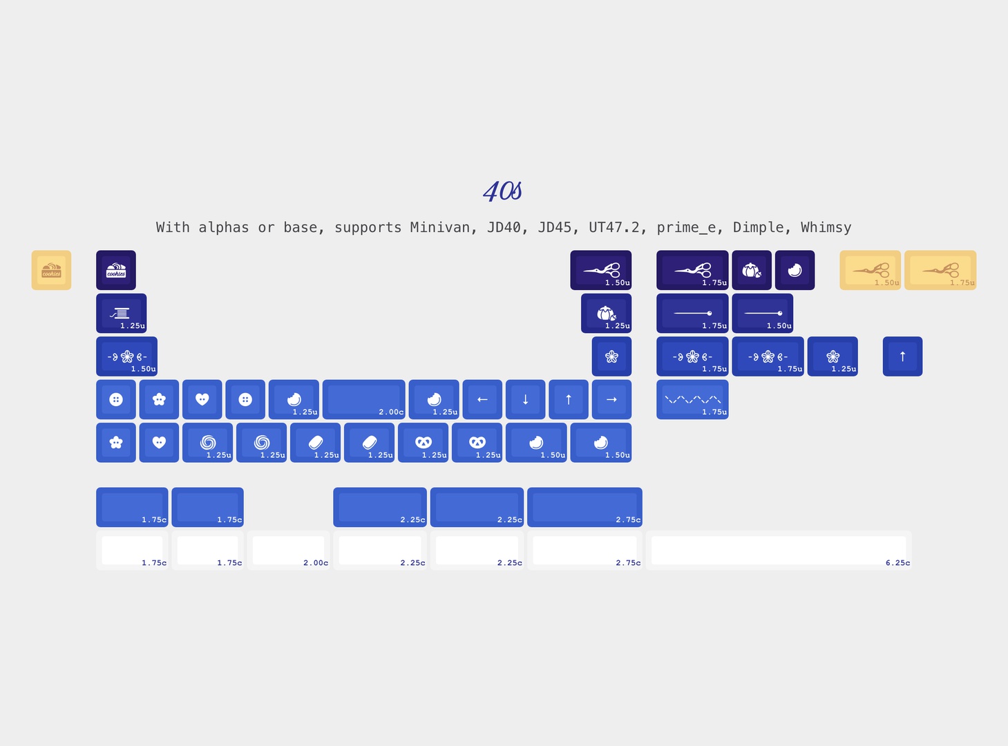 KAM Sewing Tin is a creative & beautiful set which plays on the cliché of Danish butter cookie tins being used to store sewing supplies. The set prominently features cute novelties, lowercase alphas, and a vertical gradient topped by a yellow numrow, with very modular & friendly kitting accompanied by stunning collabs and deskmats.